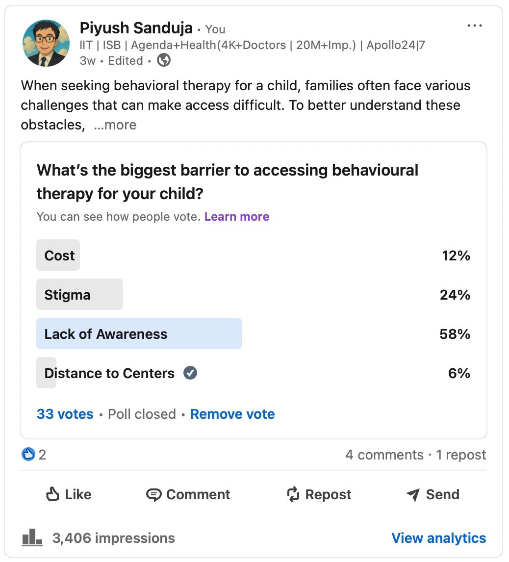 We have conducted an awareness survey to understand the challenges families face in accessing behavioural therapy for their children. A critical observation is the overwhelming lack of awareness (58%).